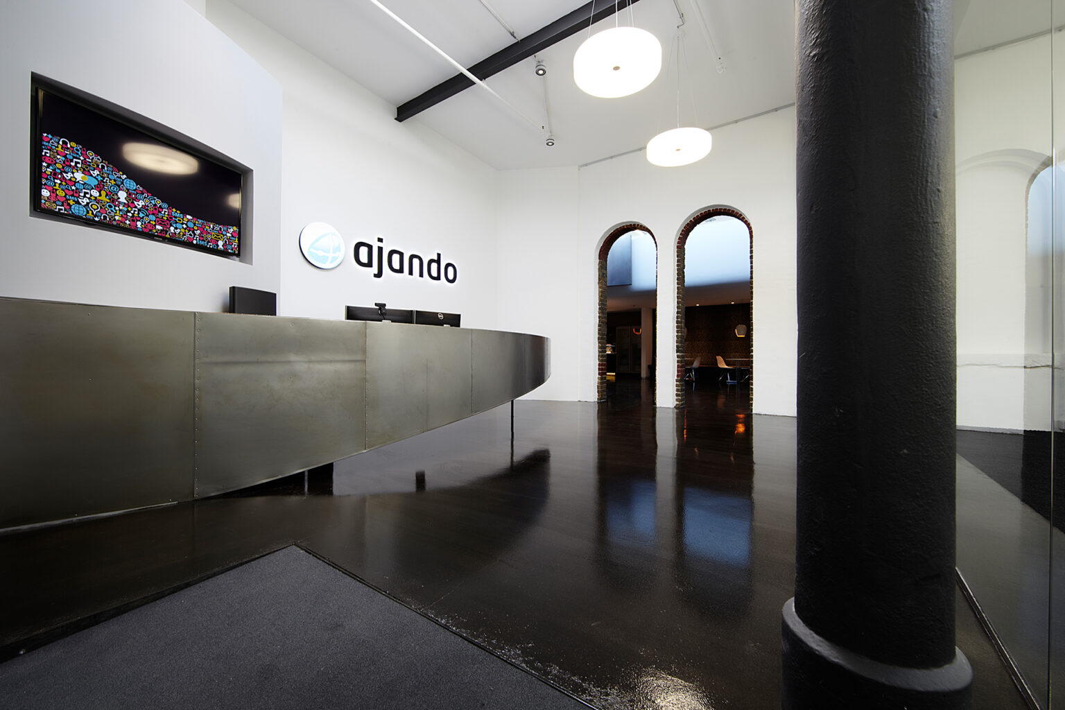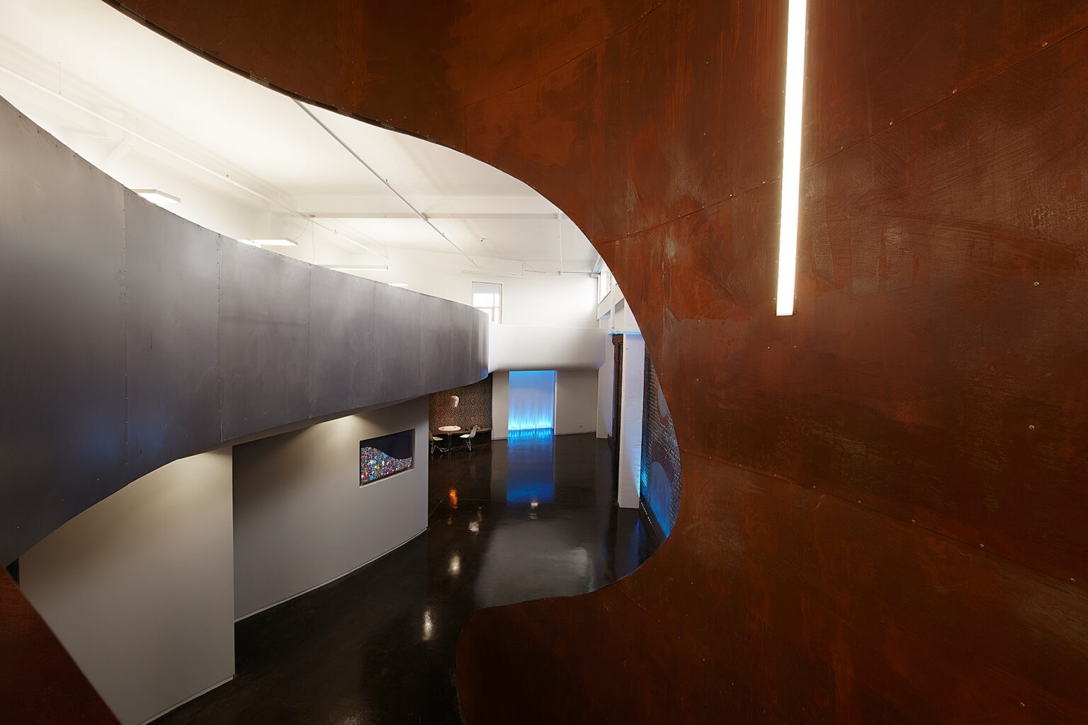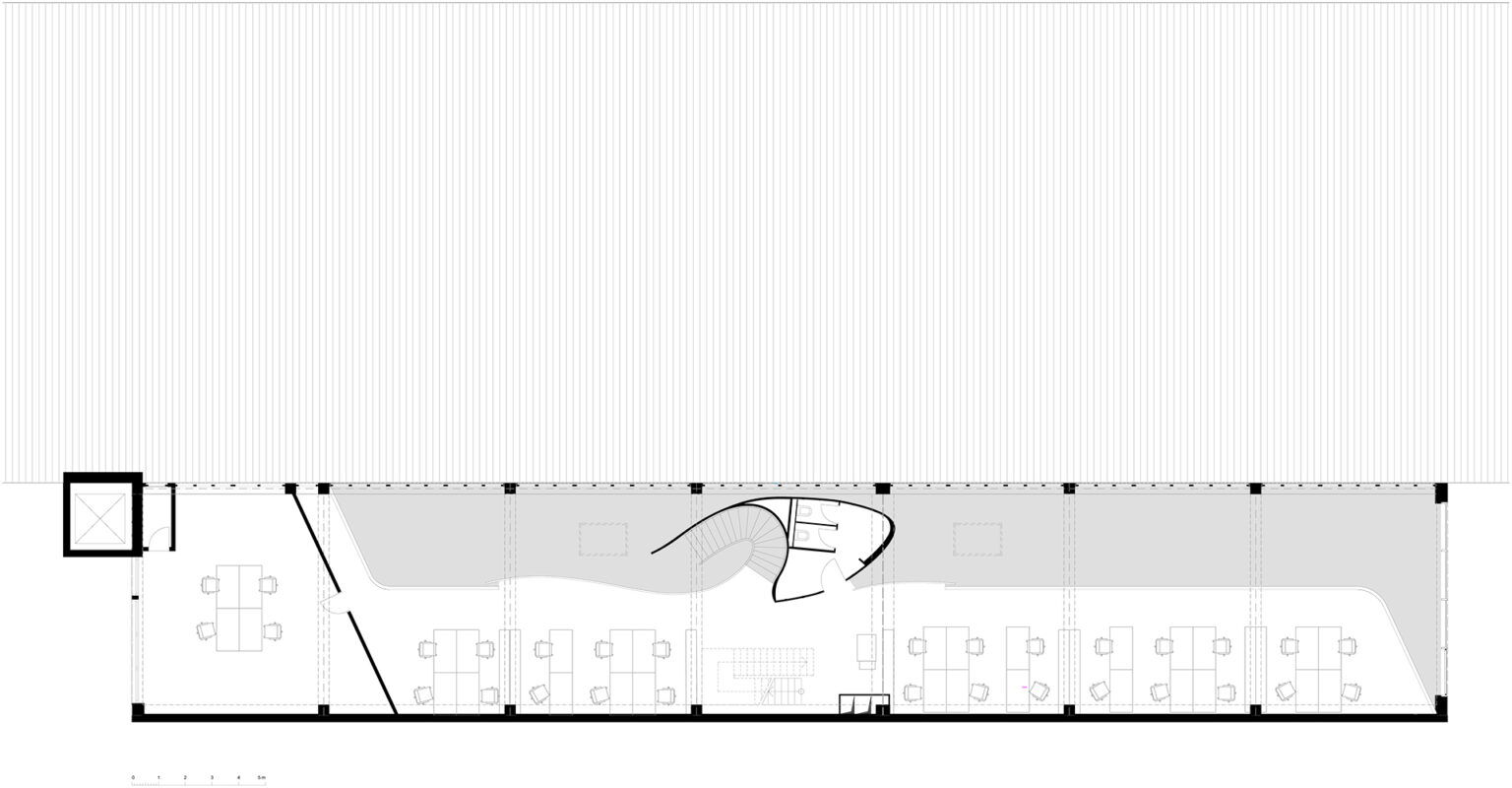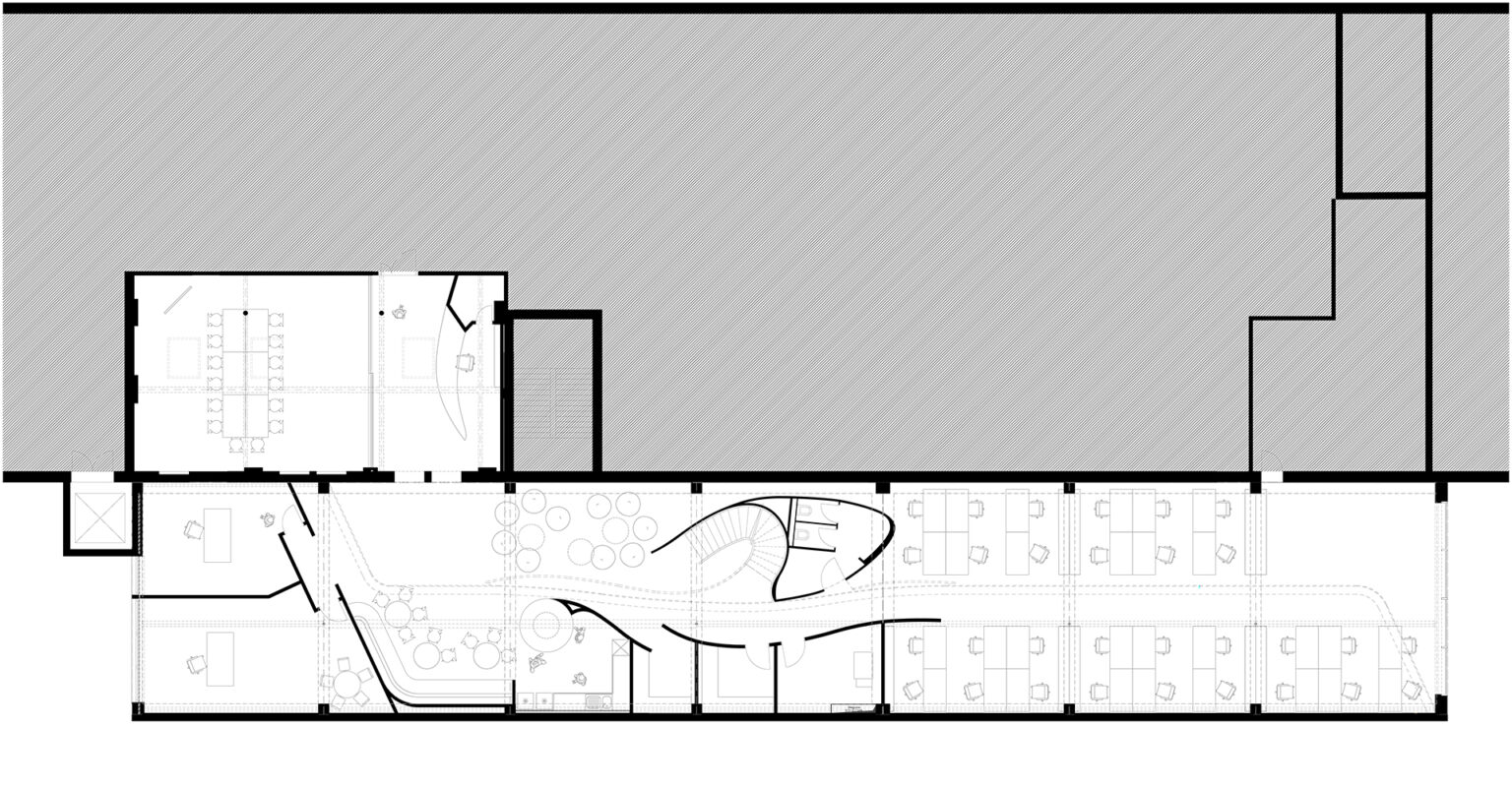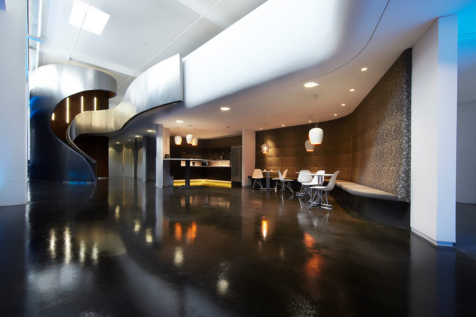 Die beinahe schwerelos schwebende Galerie bildet mit ihrer weißen, glatten und abgerundeten Form einen interessanten Kontrast zur Fassade, fügt sich jedoch harmonisch in die bestehende Betondecke ein und wird zu einer homogenen Einheit. Ein Effekt, der durch die Rundung der Brüstung und die ausfallenden Enden der Galerie noch verstärkt wird. Genau unter der Galerie, entlang einer frei geformten Kurve, befinden sich der Loungebereich sowie weitere Nebenräume. Ausreichend Raum zur kreativen Entfaltung.