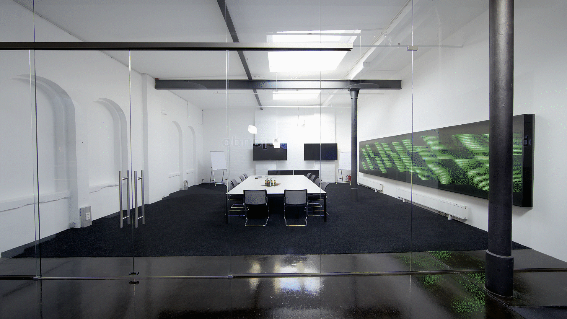Und so besteht unser realisierter Entwurf aus einer Eingangshalle mit einladendem Empfang und gegenüberliegendem großzügigen Besprechungsraum – alles innerhalb der historischen Substanz. Nachdem zwei Rundbogentore freigelegt wurden, gelangt man nun ins Loftbüro mit Galerie und Raum für bis zu 70 Arbeitsplätzen. Die Segmentierung findet hier ihren Ursprung im Entwurf und nicht in der Möblierung. Zusätzliche Neben- und Sozialräume wurden unterhalb der Galerie angeordnet.
