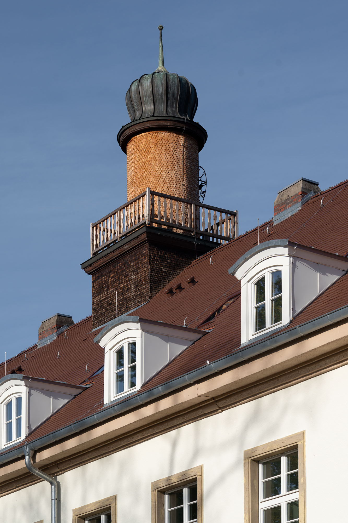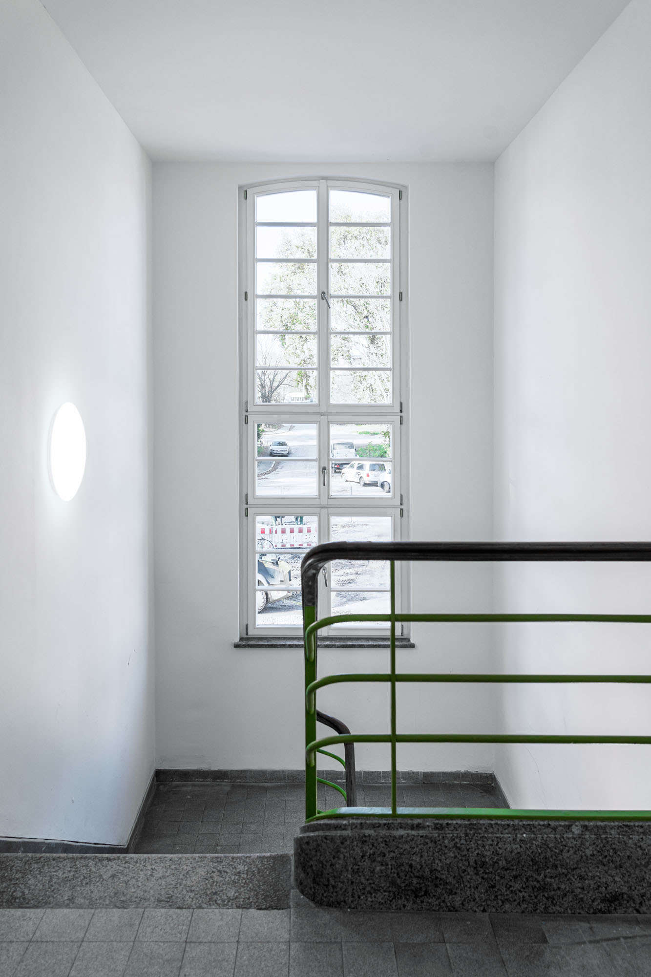 Das historische Gebäude wird entsprechend entkernt und von einer Bunkeranlage sowie späteren Anbauten aus den 70er Jahren befreit, sodass die ursprüngliche Symmetrie und die denkmalgeschützte Hauptansicht wiederhergestellt werden. Erhalten bleiben die drei originalen Eingänge, die Treppenhäuser, Decken und tragenden Wände sowie die Fassadenhülle – im Sinne eines respektvollen Umgangs mit dem Bestand. Die nicht denkmalgeschützten Bauelemente werden vollständig abgebrochen und durch eine funktionsgerechte Neubau‑Ergänzung ersetzt.